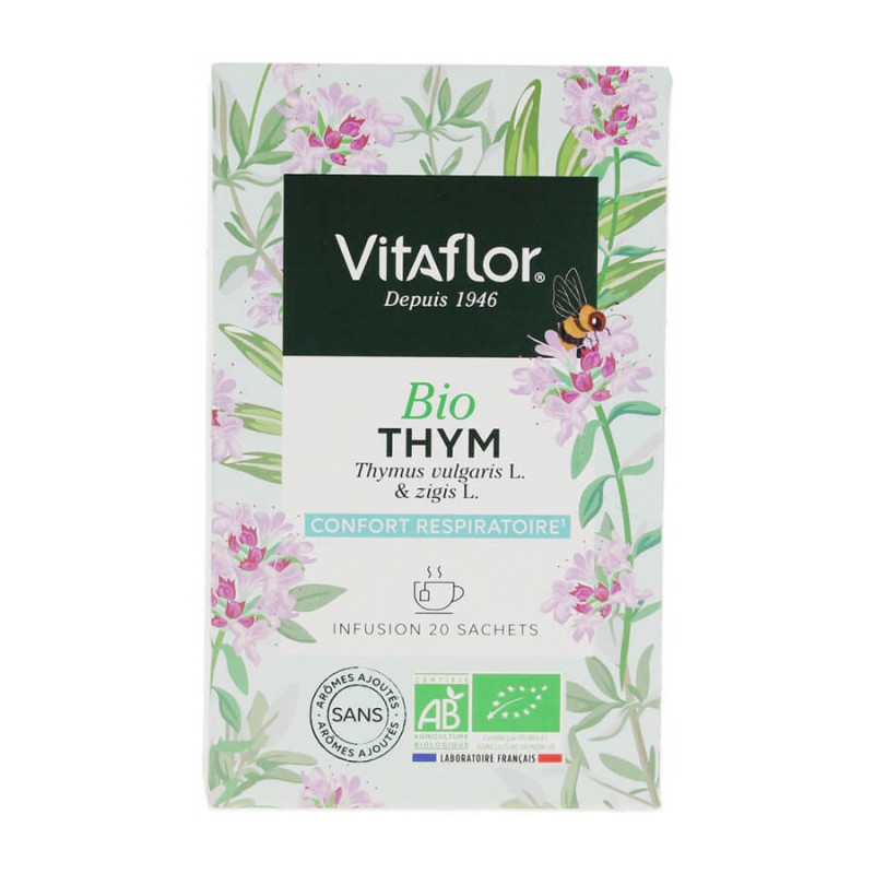 Vitaflor Thyme Bio 18 Sachets is an infusion based on aerial parts of Thyme which contribute to clear the respiratory tracts and to support their good functioning. This infusion gets a soothing and pleasant effect on the irritated throats, the pharynx and the vocal cords.