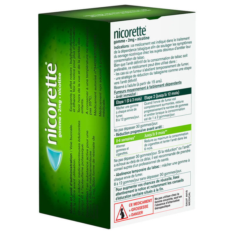 Complete cessation of smoking The treatment of nicotine addiction is usually done in 2 phases. 1st phase: Chew a piece of gum each time the urge to smoke appears. The number of chewing gums containing 2 mg is generally 8 to 12 gums per day and should never exceed 30 gums per day. The duration of this phase is approximately 3 months, but may vary depending on individual response. 2nd phase: When the urge to smoke is completely overcome, gradually reduce the number of gums chewed per day. Treatment will be stopped when consumption is reduced to 1 to 2 gums per day.