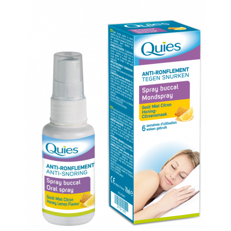 Quies anti-snoring mouth spray acts directly on the causes of snoring: thanks to xanthan gum, it lubricates the soft palate and thus prevents vibrations when breathing. Formulated without vegetable oils, its active ingredients keep the back of the throat moist throughout the night.