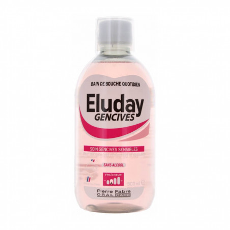 Pierre Fabre Oral Care Eluday Gencives Bain de Bouche Quotidien 500 ml est une solution prête à l'emploi formulée pour renforcer et apaiser les gencives sensibles :