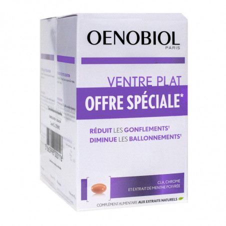 La formule exclusive d'Oenobiol Femme 45+ Ventre Plat associe du chrome pour réguler la glycémie, de lacide linoléique conjugué (CLA) pour freiner le stockage des acides gras et un extrait de lin équilibrant.