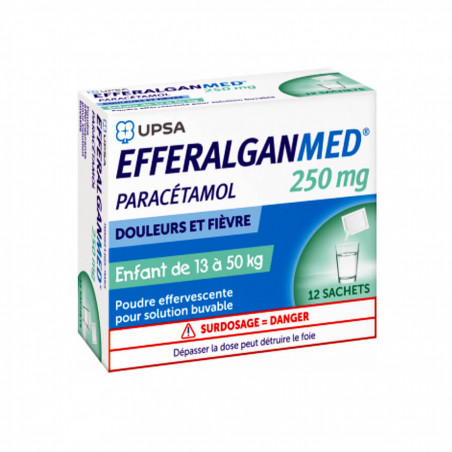 Indications : Dafalgan devient EfferlaganMed. EfferalganMed 250 mg poudre est un médicament à base de Paracétamol indiqué dans le traitement symptomatique des douleurs d'intensité légère à modérée et/ou des états fébriles chez l'enfant pesant entre 13 et 50 kg (environ 2 à 15 ans).